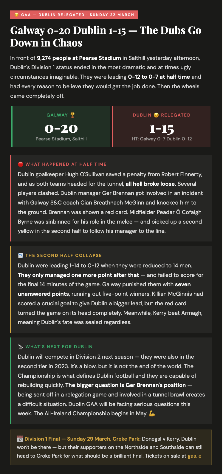 Look — there's no easy way to start this Monday. The Dubs are relegated. Division 2 football next year for the first time since 2023. Manager sent off. Red cards. Seven unanswered points. A crowd of 9,274 watching it happen in Salthill. We'll get into the full drama below — but first, take a breath, and know that there is plenty more going on in this city worth reading about today too.