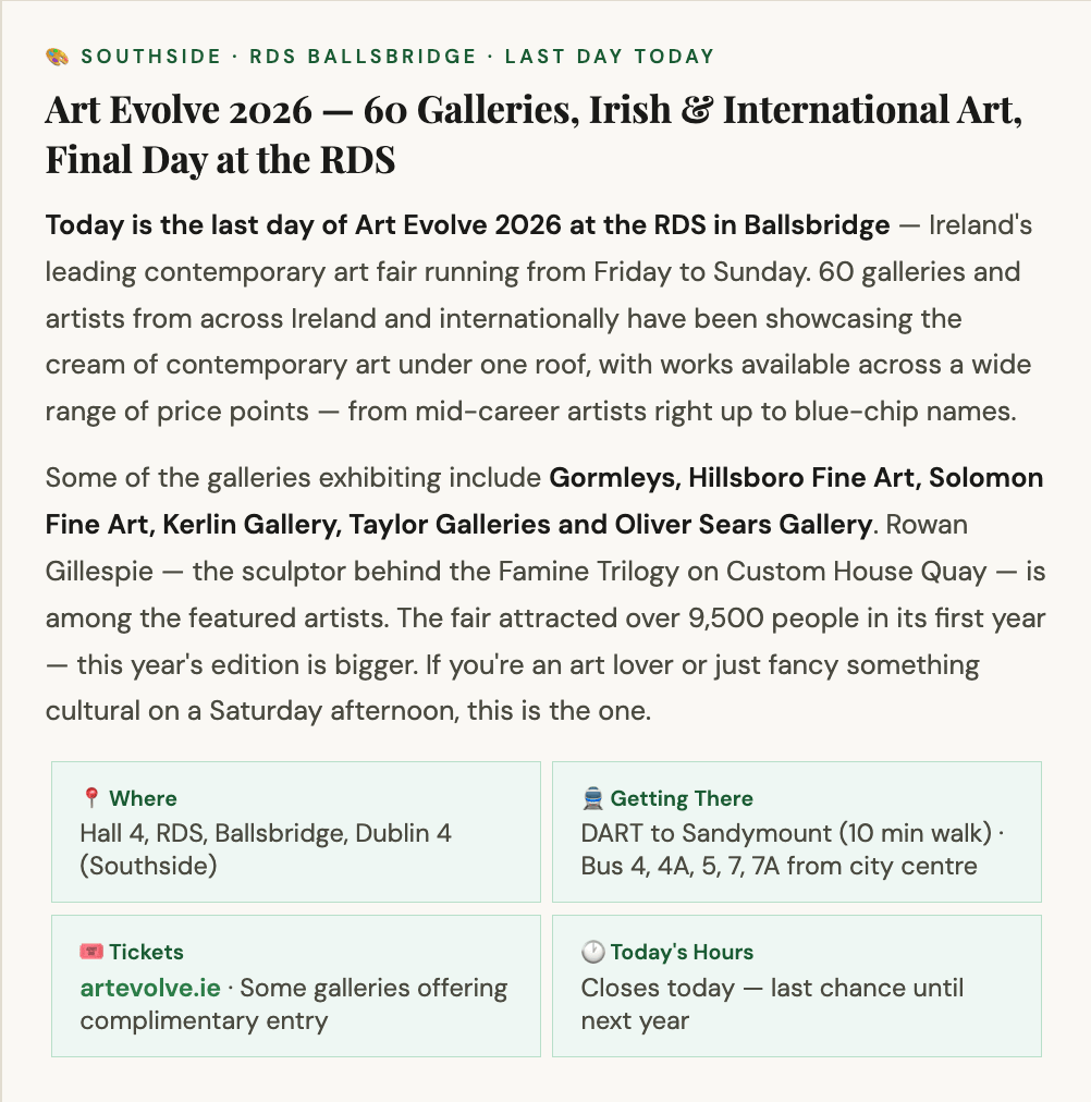 There is genuinely a lot to do in this city today. Walk the blossom on Griffith Avenue this morning. Catch Art Evolve at the RDS this afternoon. Head to the GAA double header at Croke Park from 5pm tonight. Or go to the Divine Comedy at the NCH or Frances Black in Dún Laoghaire — and end up in a trad session wherever takes your fancy. Dublin at its best.