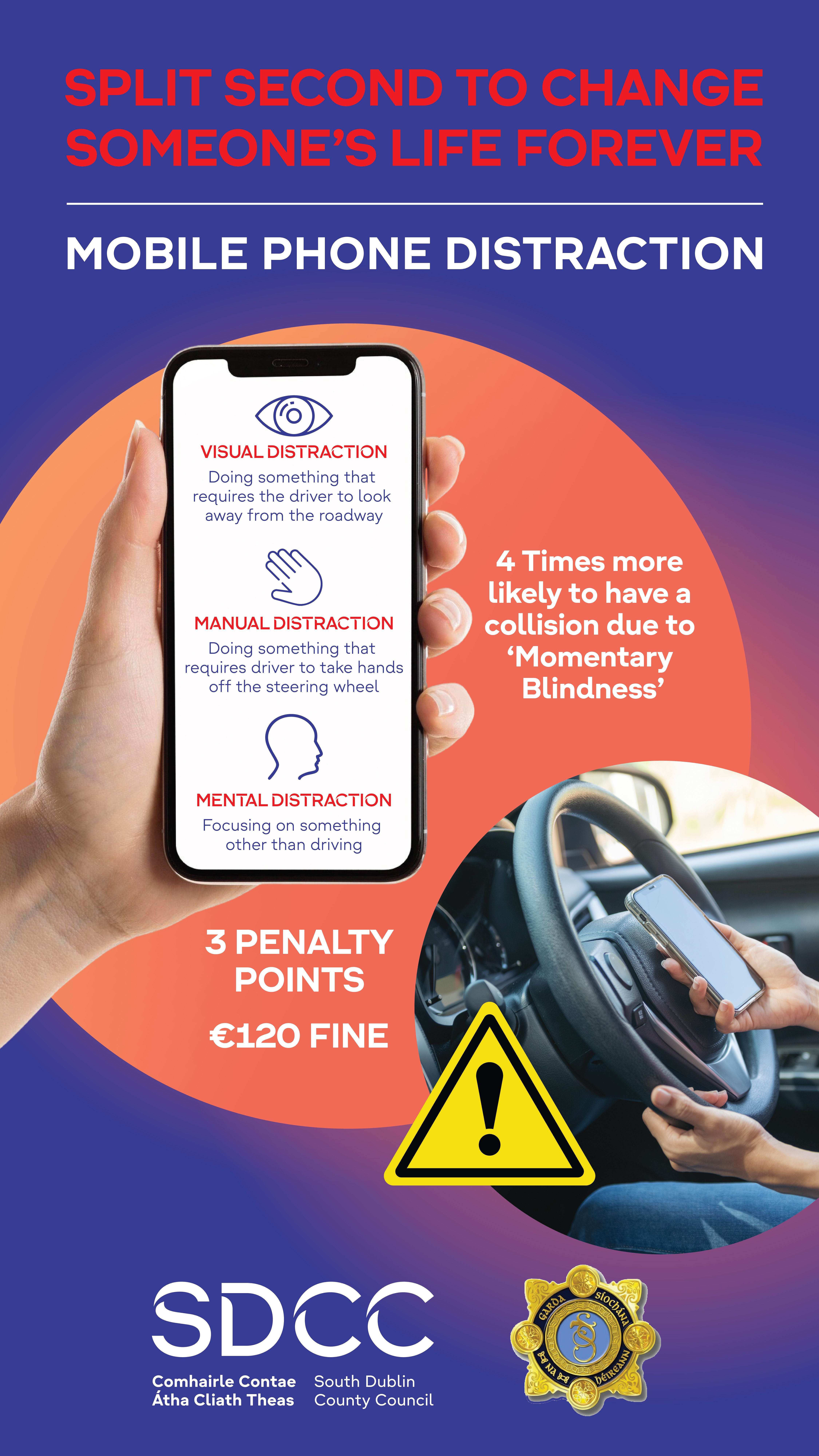 “A Split Second" is the theme for today’s campaign. Gardaí are highlighting that using a phone while driving makes you four times more likely to crash.